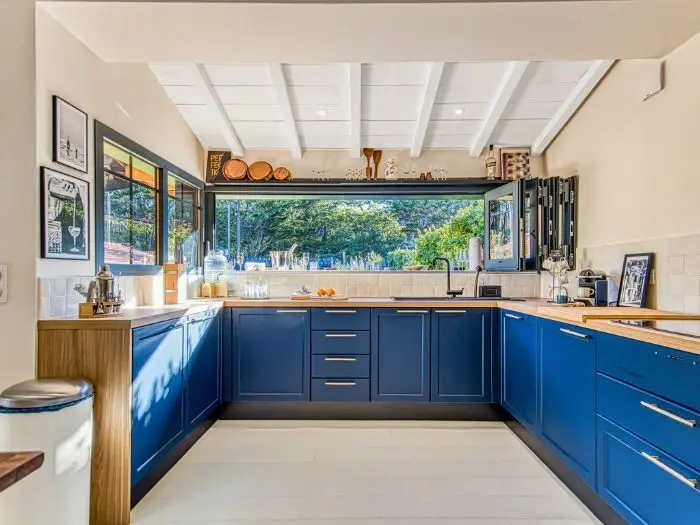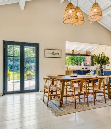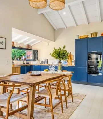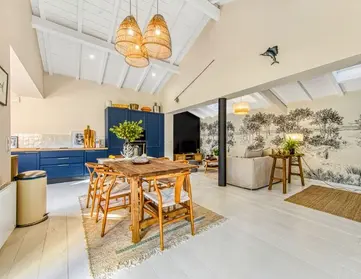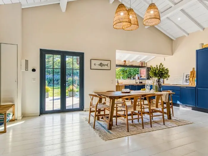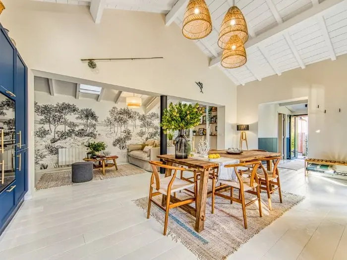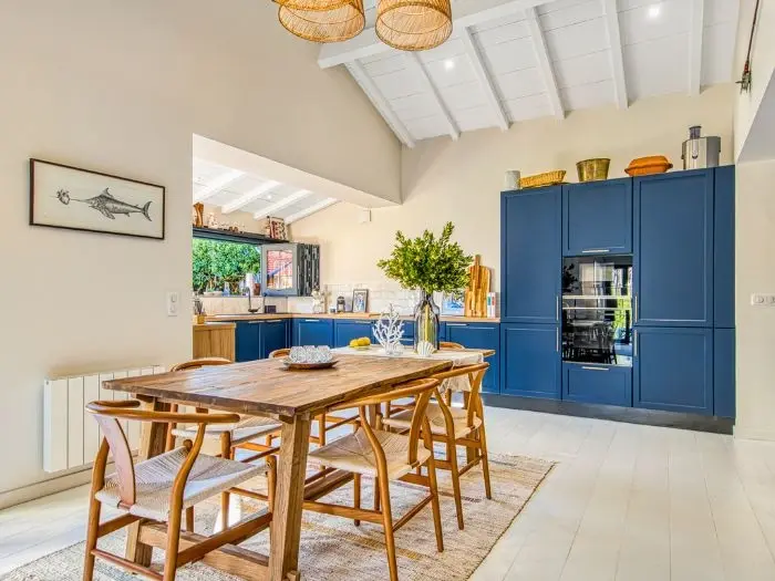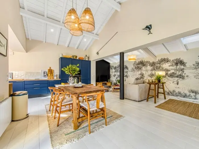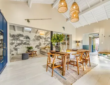 Open and luminous, the house features a signature blue kitchen that honours its century-old culinary heritage, along with a generous living area and a wide terrace. The interiors are modern Atlantic chic, with white walls and flooring, a cabane-style wooden ceiling, and hand-painted Dune du Pilat wallpaper. Light-filled and airy, the house celebrates its connection to the surrounding landscape, with the dunes just steps away and the sea within easy reach, creating a perfect setting for family lunches, pétanque, and the gentle rhythm of coastal life.
