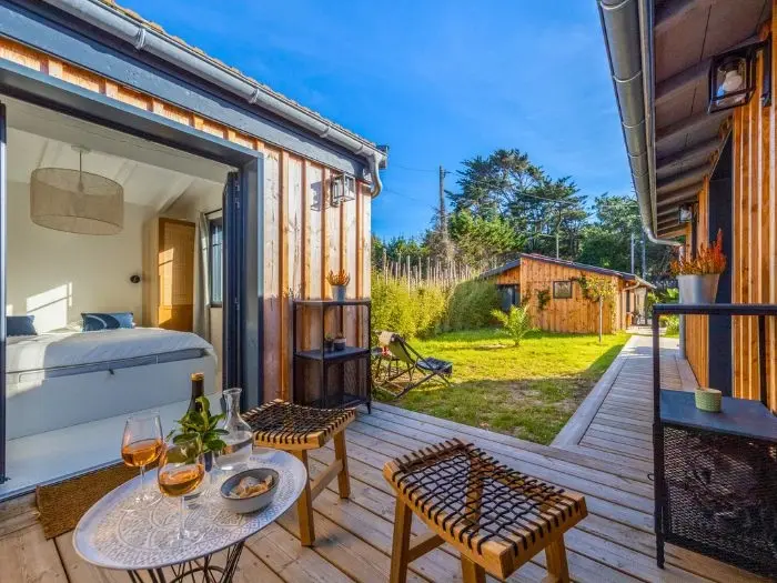 Evoking the atmosphere of life aboard a boat, this house features two bedrooms, a spacious bathroom, and a living room with a kitchenette. The interiors blend elegant maritime touches with bright, airy spaces, while the front and side decks offer privacy and a place for quiet reflection. An outdoor shower enhances the feeling of coastal living, reminiscent of being on a vessel moored close to the shore, making it ideal for families seeking a serene, nautical escape.